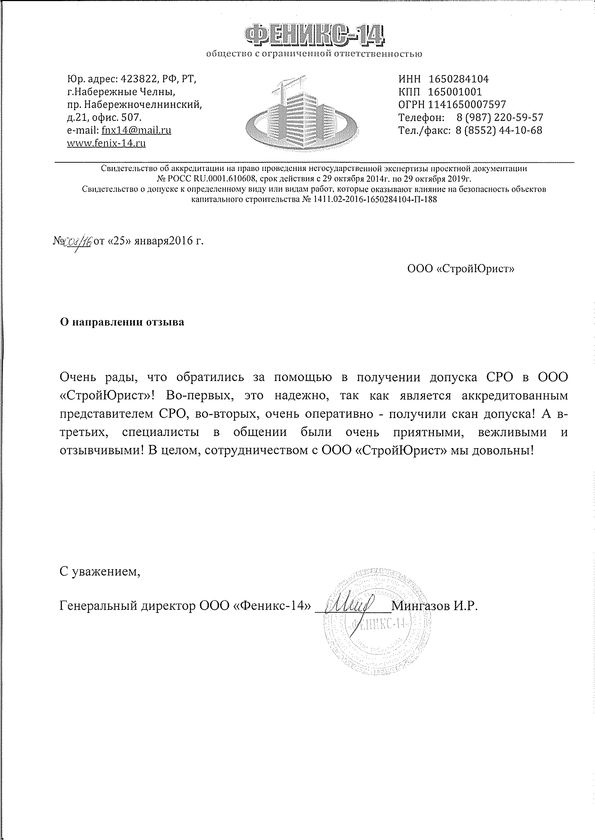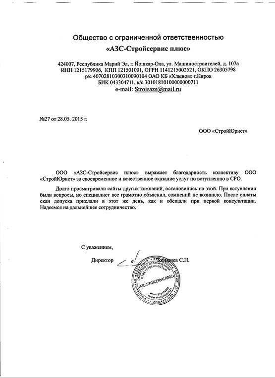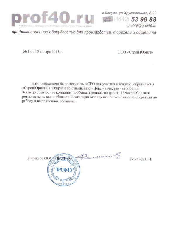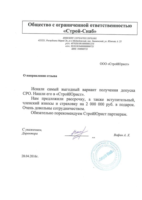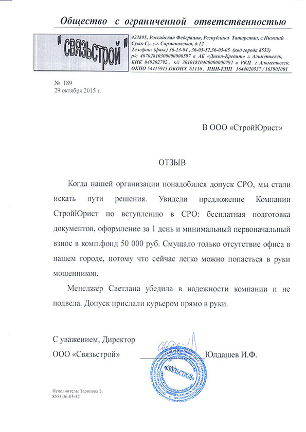 Отзывы клиентов "СтройЮрист" по вступлению в СРО в Одинцово